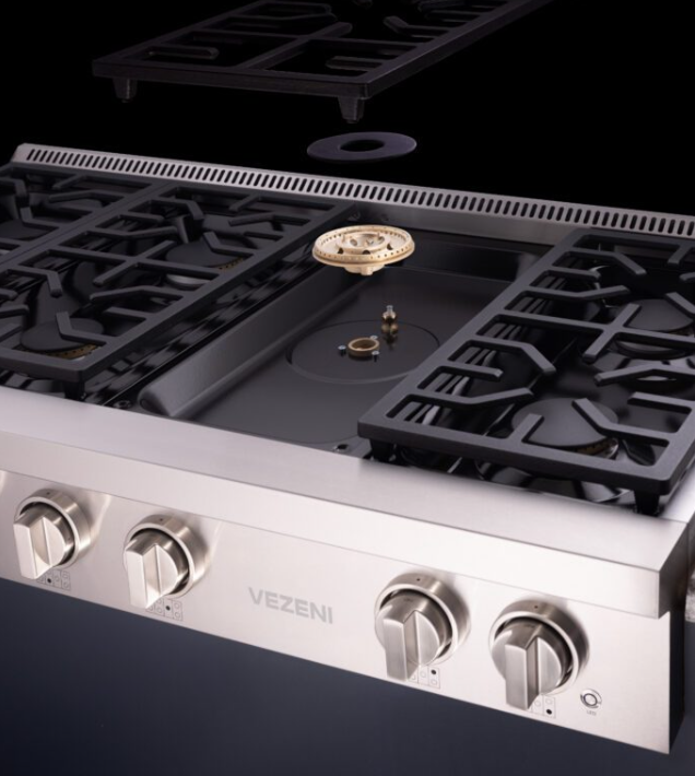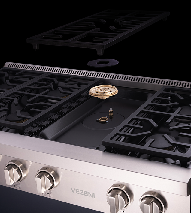 The Vezeni professional-style range top has a sleek and elegant design, fusing the aesthetic appeal of a cooktop with the outstanding functionality seen in our Randolph range. It offers consistent heat distribution and a seamless cooking surface to meet the demands found in a professional kitchen.