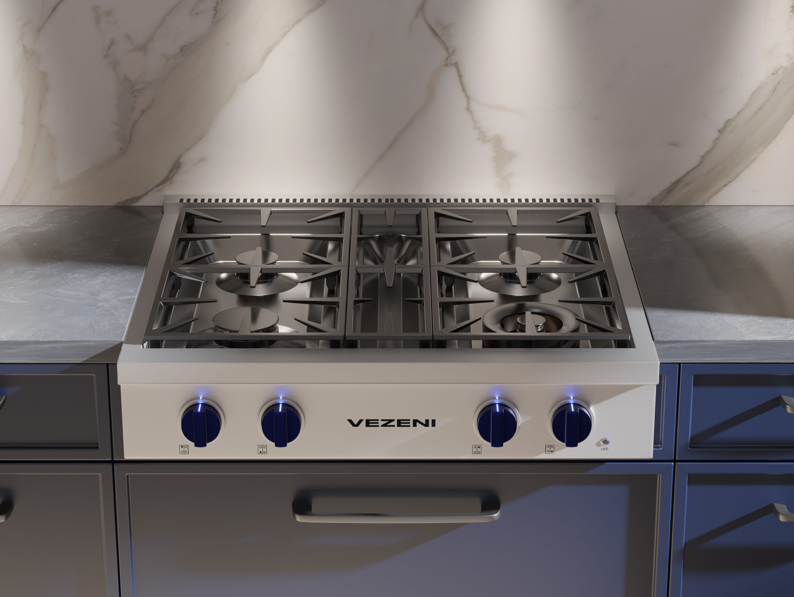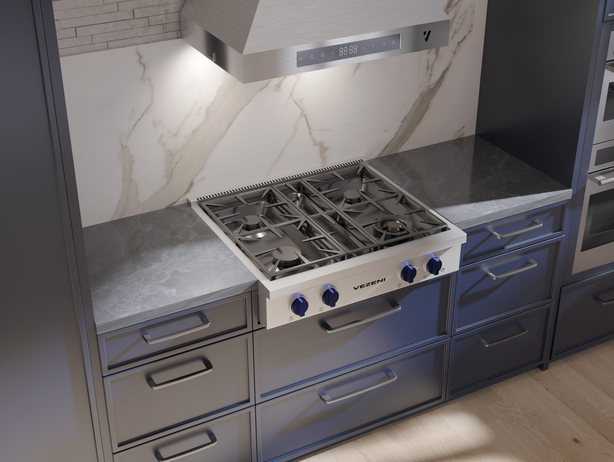 A rangetop typically installs into your countertop but extends to the front of your cabinets, while a cooktop is flat with a built-in look. Our rangetop mimics the look and feel of a professional range without an oven attached. Vezeni’s range tops offer front-facing knobs and heavy-duty construction, ideal for serious home chefs seeking premium design and control.