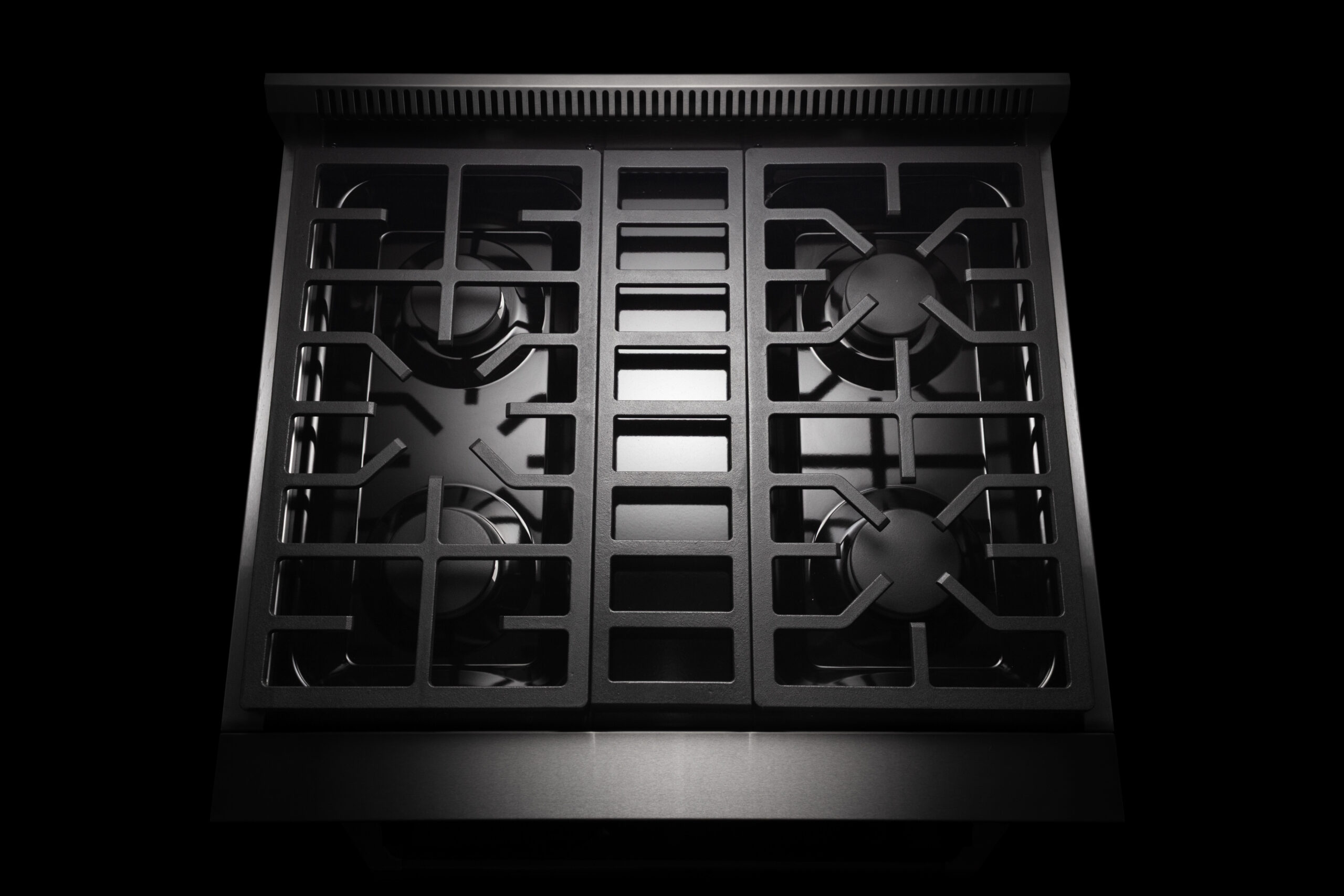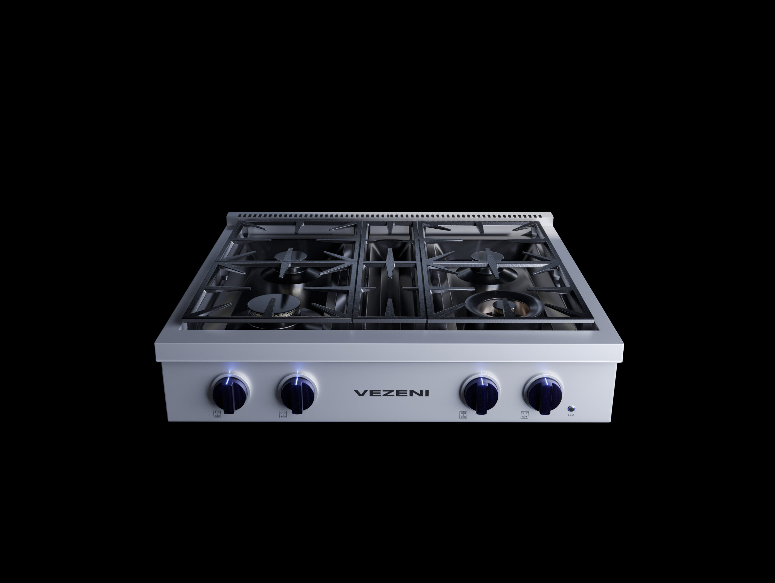 The 30″ Vezeni rangetop offers four powerful burners, including two 9,000 BTU auxiliary and two 18,000 BTU rapid German brass burners. Crafted with Italian aluminum burners and durable cast-iron grates, it delivers precise heat control and lasting performance. The sleek stainless steel surface and LED-lit blue and silver knobs combine style with easy cleaning, making it ideal for compact kitchens seeking professional quality.