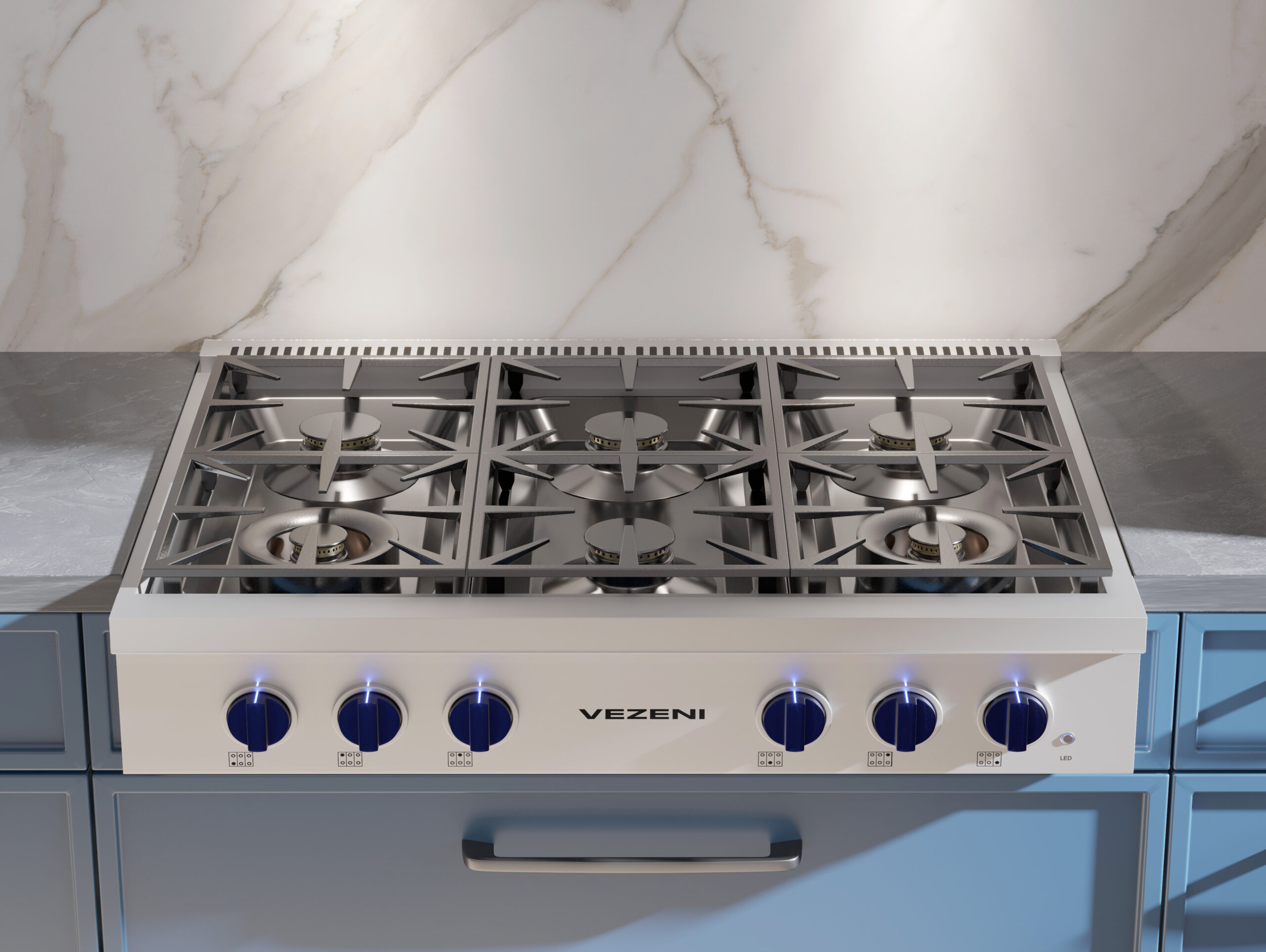 Vezeni rangetops feature Italian-made sealed burners offering powerful BTU output and precision control, including burners ideal for both simmering and searing.